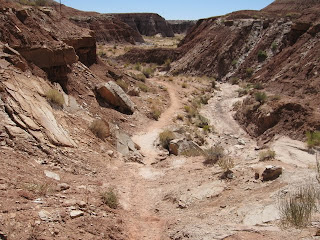 Bloody HOT... especially when I'd been used to 80 mph's worth of breeze. Now all was still and airless... the sun was crackling hot and relentless. My stupid armored boots slogged through loose sand and crumbling strata and within a short time I was panting. I keep forgetting the altitude in these places.. and at 5000 feet you're breathing heavily. The only "trail" there was amounted to previous footsteps...often hard to see. Basically I just followed the dry "wash".